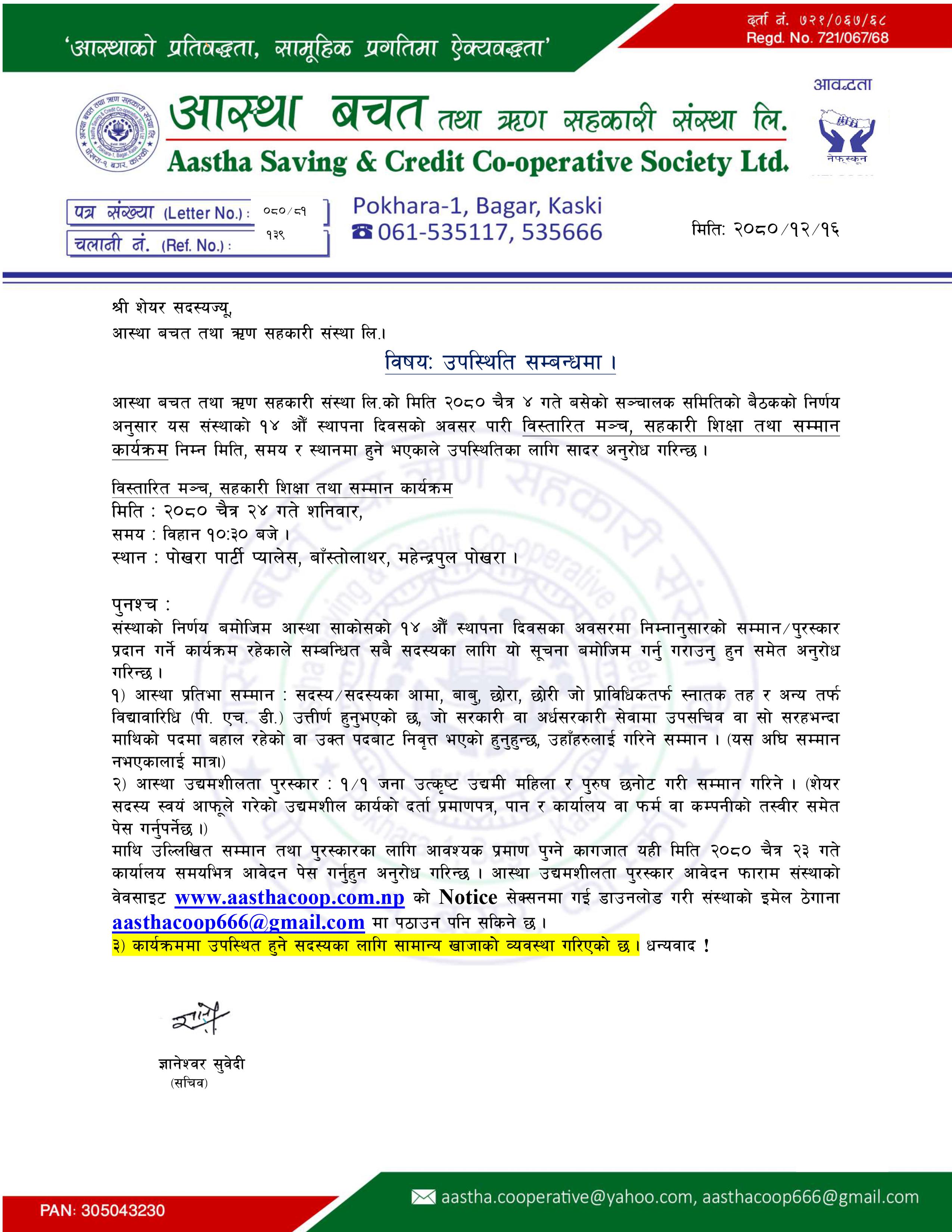 १४ औ स्थापना दिवसको अबसरमा आयोजित सदस्य सम्मान सहकारी शिक्षा तथा बिस्तृत मंच २०८० चैत्र २४ शनिवार पोखरा पार्टी प्यालेस बस्तोलाथर पोखरा बिहान १०:३० बजे