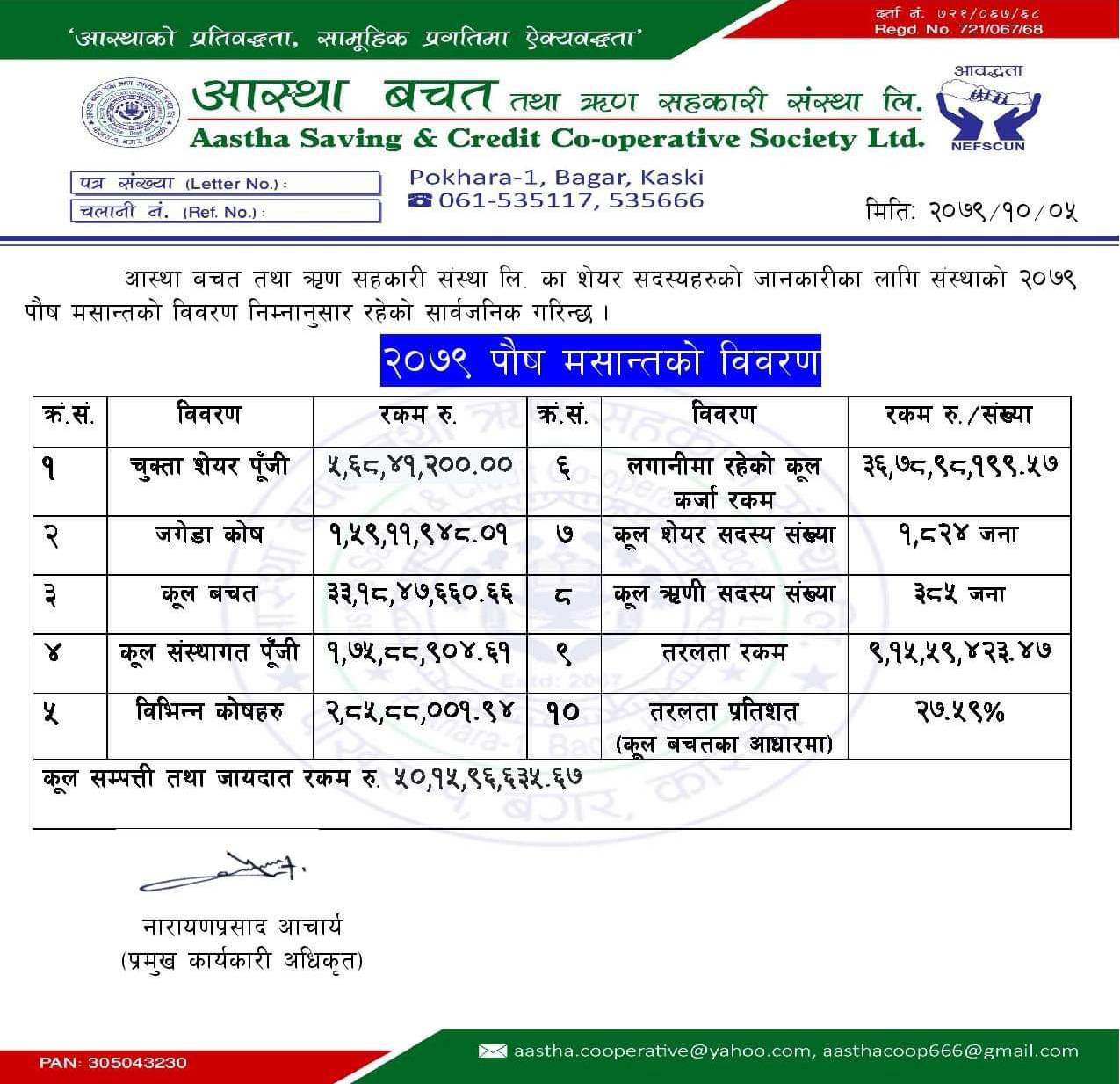 सहकारी विभागकाे निर्देशन बमाेजिम पेश गरिएकाे मासिक विवरणः २०७९ पाैष मसान्तकाे