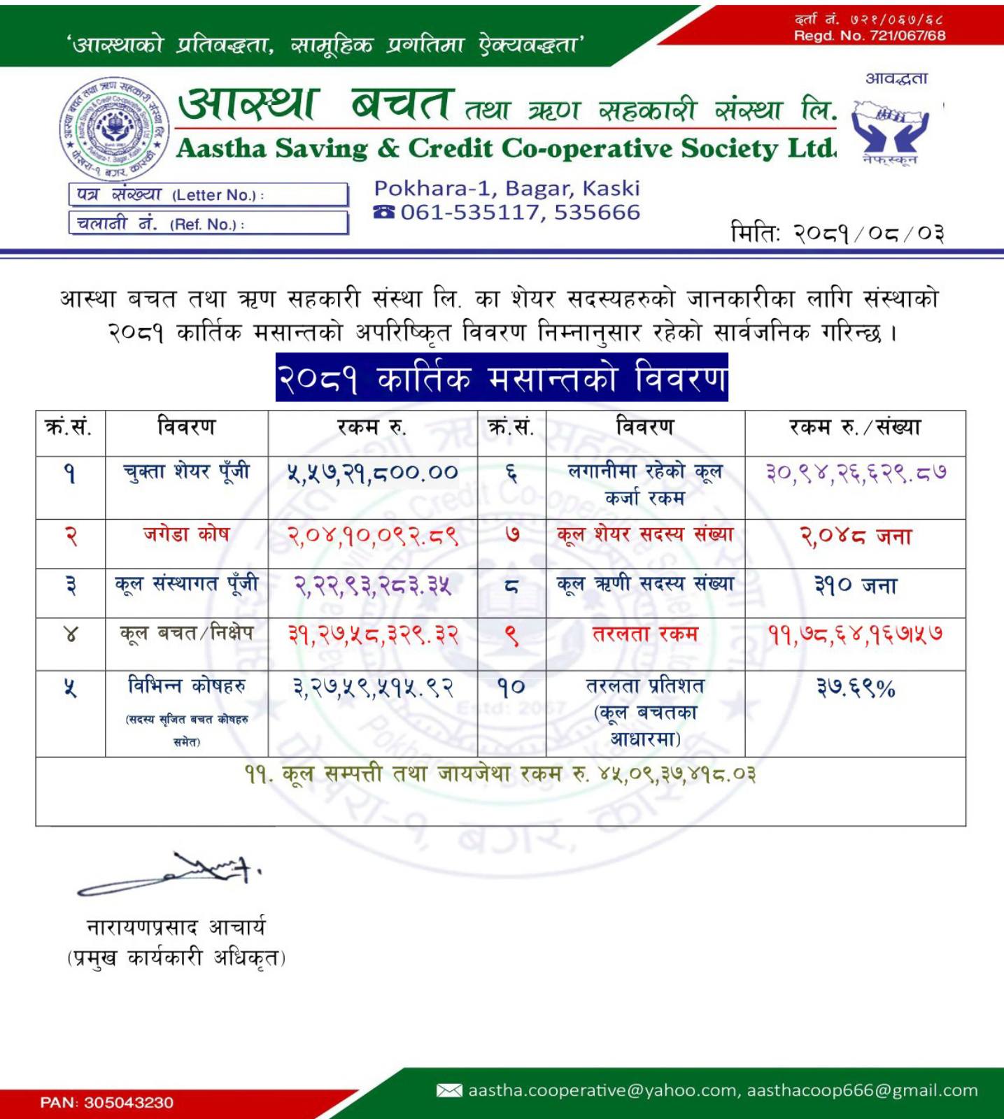 आदरणीय शेयर सदस्यज्यूहरु यस आस्था बचत तथा ऋण सहकारी संस्था लि को २०८१ कार्तिक मसान्तसम्म को विवरण यसप्रकार रहेको जानकारी गरिन्छ I धन्यवाद
